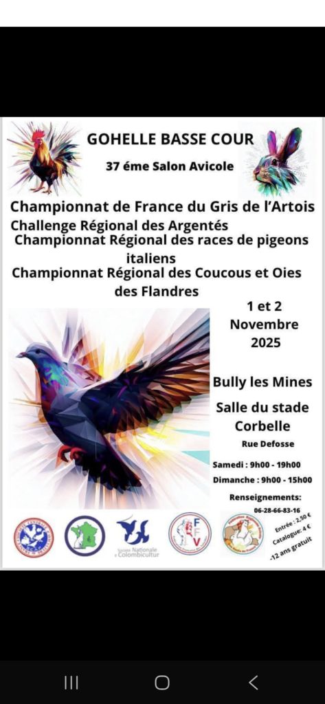 - 1er et 2 novembre 2025 à Bully-les-Mines (62). Exposition internationale organisée par Gohelle Basse Cour. Championnats de France du Gris de l’Artois, régional des Lapins Argentés, régional des races de Pigeons Italiens, et régional des coucous et Oies des Flandres. Contact : Bruno Bouillet, tél. 06 87 85 88 63, e-mail bruno.bouillet@eiffage.com