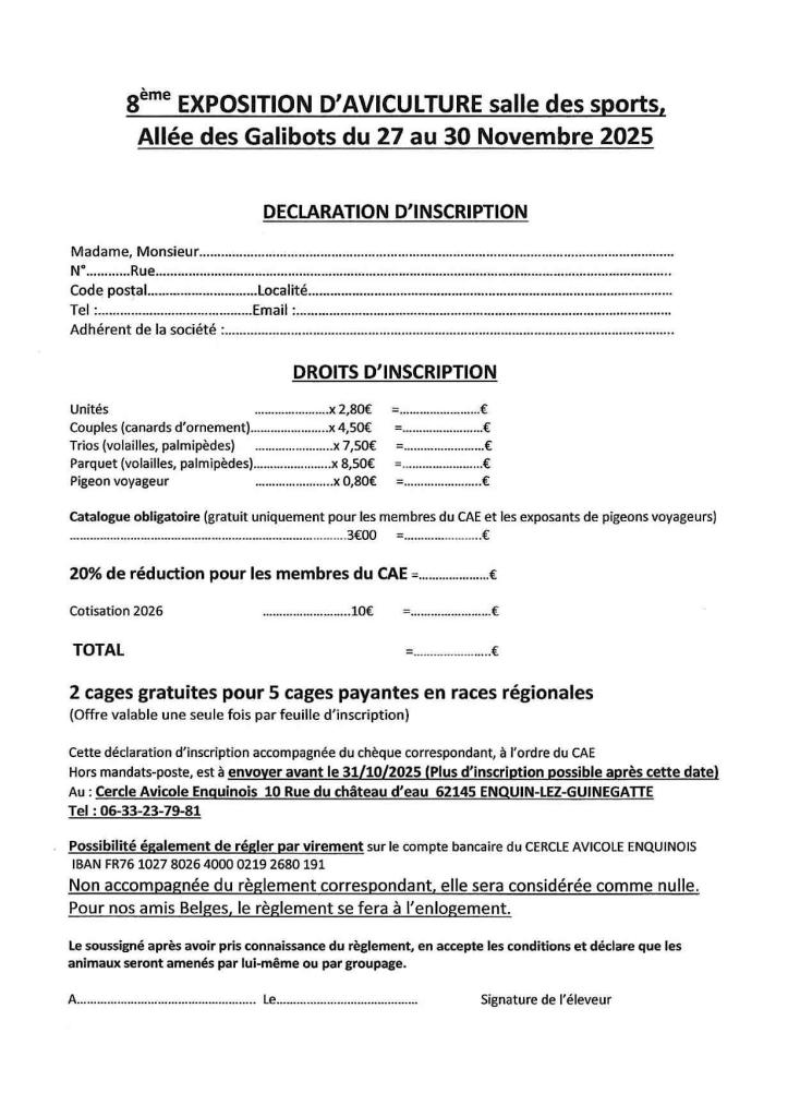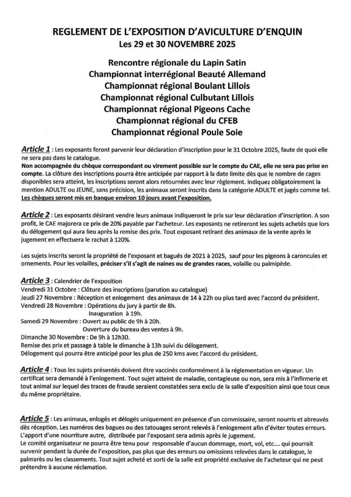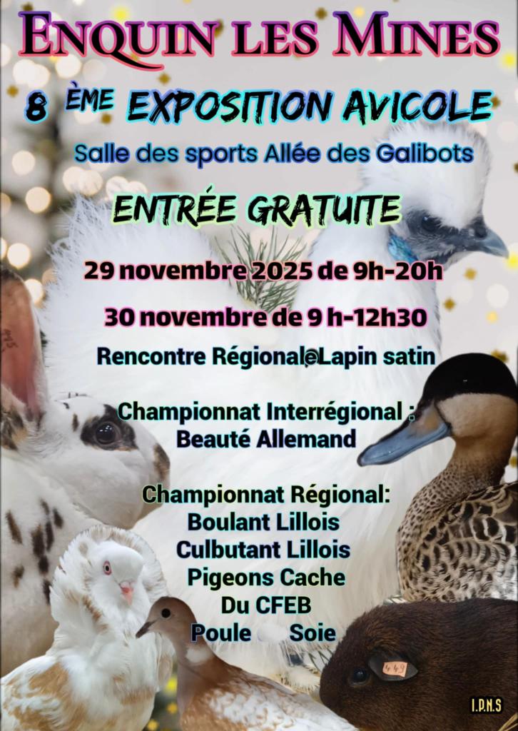 - 29 au 30 novembre. Enquin-les-Mines (62). Le Cercle Avicole Enquinois organise son exposition nationale à la Salle des Sports, Allée des Galibots, à Enquin-les-Mines. Championnat interrégionale du pigeon de Beauté Allemand. Championnats Régionaux : Boulant Lillois, Culbutant Lillois, Pigeons de vol, Poule Soie, Lapin Satin. David Corroyette Tél 06 33 23 79 81 e-mail cercleavicole.enquinois@bbox.fr