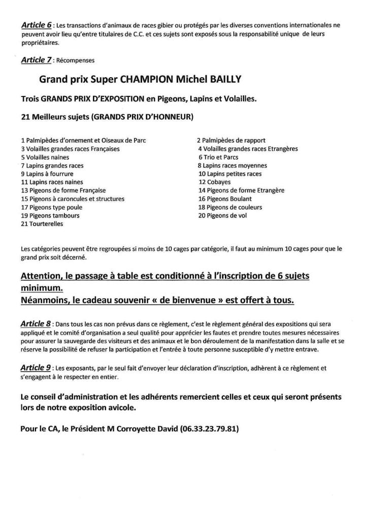 - 24 et 25 janvier. Marsac sur l’Isle (24). Exposition nationale organisée par le Groupement Avicole Périgourdin. Championnat de France de la Tête Colorée de Brive, Pigeon Fantail, Pigeon d’origine Italienne, Pigeon Type Poule, Pigeon Romain. Championnat Régional Poules : Poules Pékin et Cochin, Poules Sérama. Championnat Régional : Pigeons Mondain et de l’APADOM (Palmipèdes Domestique). Championnat Régional : Lapins Rex. Merle Pascal tel. 06.72.52.48.07. E-mail pascal.merle99@gmail.com