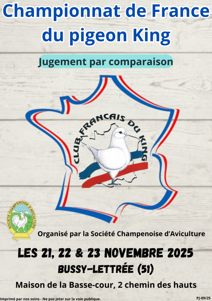 - 22 et 23 Novembre Bussy-Lettrée (51). Championnat de France du King organisée par la Société Champenoise d’Aviculture. Prévostat Jean-Marie tél 06 21 84 63 32