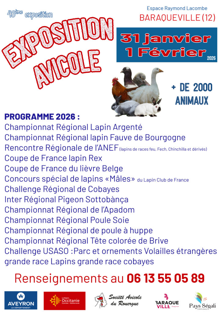 - 29 janvier au 1er février. Baraqueville (12). Exposition nationale organisée par la Société Avicole du Rouergue (S.A.R).Championnat régional Argenté et du Fauve de Bourgogne, Rencontre régionale de l’ANEF (lapins de races Feu, Feh, Chinchilla et dérivés). Coupe de France du Rex, du lièvre Belge. Concours spécial de lapins « Mâles » du lapin club de France. Challenge régional de cobayes. Inter régional SottoBanca. Régional Tête noire de Brive. Championnat régional de l’Apadom, Poule Soie, de poule à huppe. Partenaire de la course aux points. Contact : Régis Mouysset tél 06 43 43 12 98 , e-mail mouyssetr@wanadoo.fr